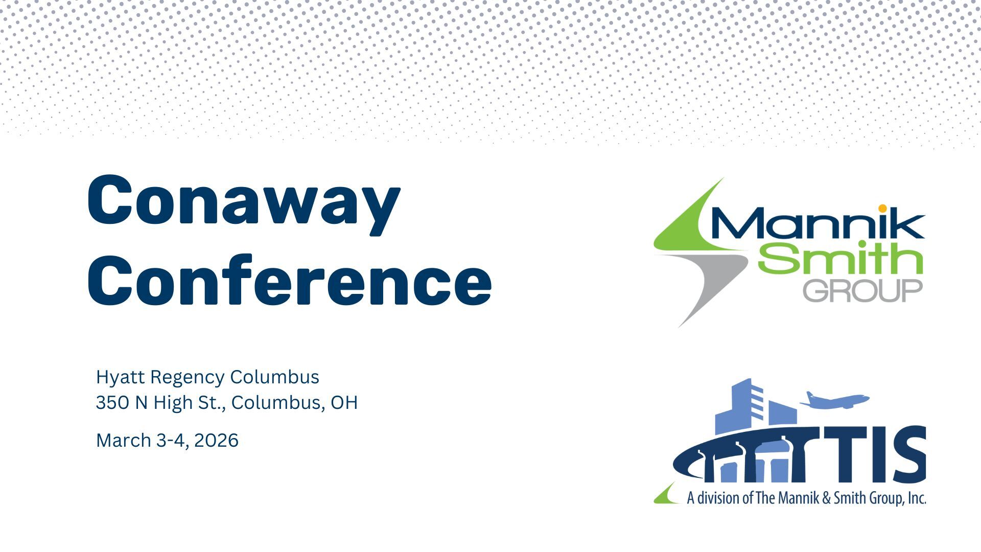 All of us at The Mannik & Smith Group, Inc. (MSG) and True Inspection Services (TIS), a division of The Mannik & Smith Group, Inc. are looking forward to attending the Conaway Conference. The Ohio Contractors Association (OCA) is hosting this year's event March 3 & 4, 2026 at the Hyatt Regency Columbus located at 350 N High St., Columbus, OH.